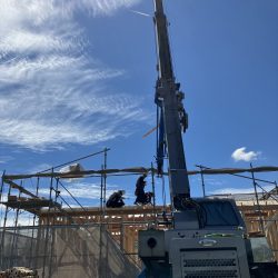 上棟が終了した現場では、床下地を組んで構造金物が取り付いた後、大工さんの次の作業としまして屋根裏・壁断熱材の充填にかかっていきます。