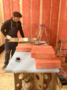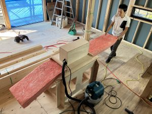 リグスタイルではこの断熱にこだわっていまして、断熱材は高性能グラスウールを採用し、カットをした断熱材を特殊な入れ方で柱間に充填していきます。写真では見た事あったのですが、この会社に入って初めて施工する状況を見させて頂きました。