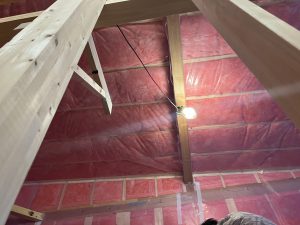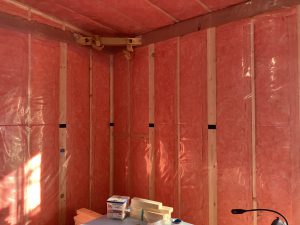 充填した後は、これまた隙間が出来ないよう防湿気密シートを建物を覆うように中から張っていきます。この後、電気設備屋さんもシートを破らないよう、慎重に配線・コンセントBOX等を施工していき、隙間のできないようにこれまた特殊な方法で行っていきます。