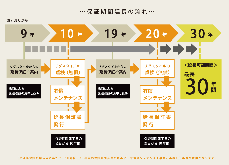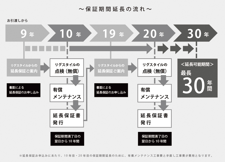 リグスタイルカンパニーでは、10年間の瑕疵保険のみならず、お客様との生涯のお付合いの証として、長い間快適に、安心して暮らしていただけるよう、最長で60年までの延長保証システムにも対応しています。