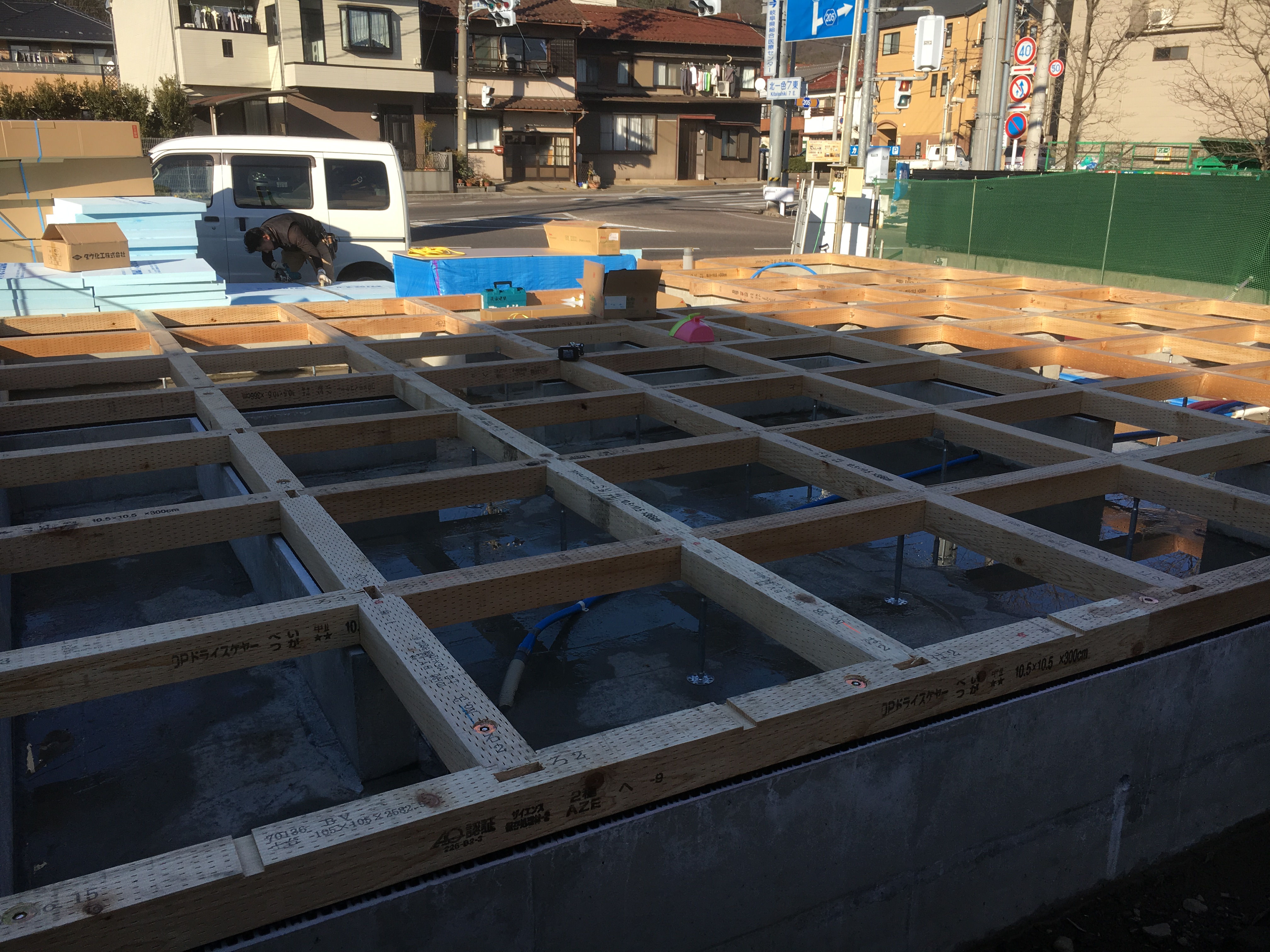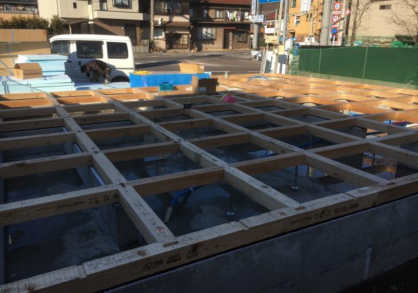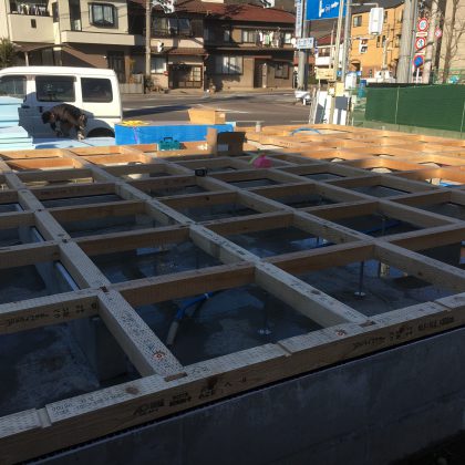 土台敷きとは、基礎コンクリートの上に土台や大引を設置していく作業。
