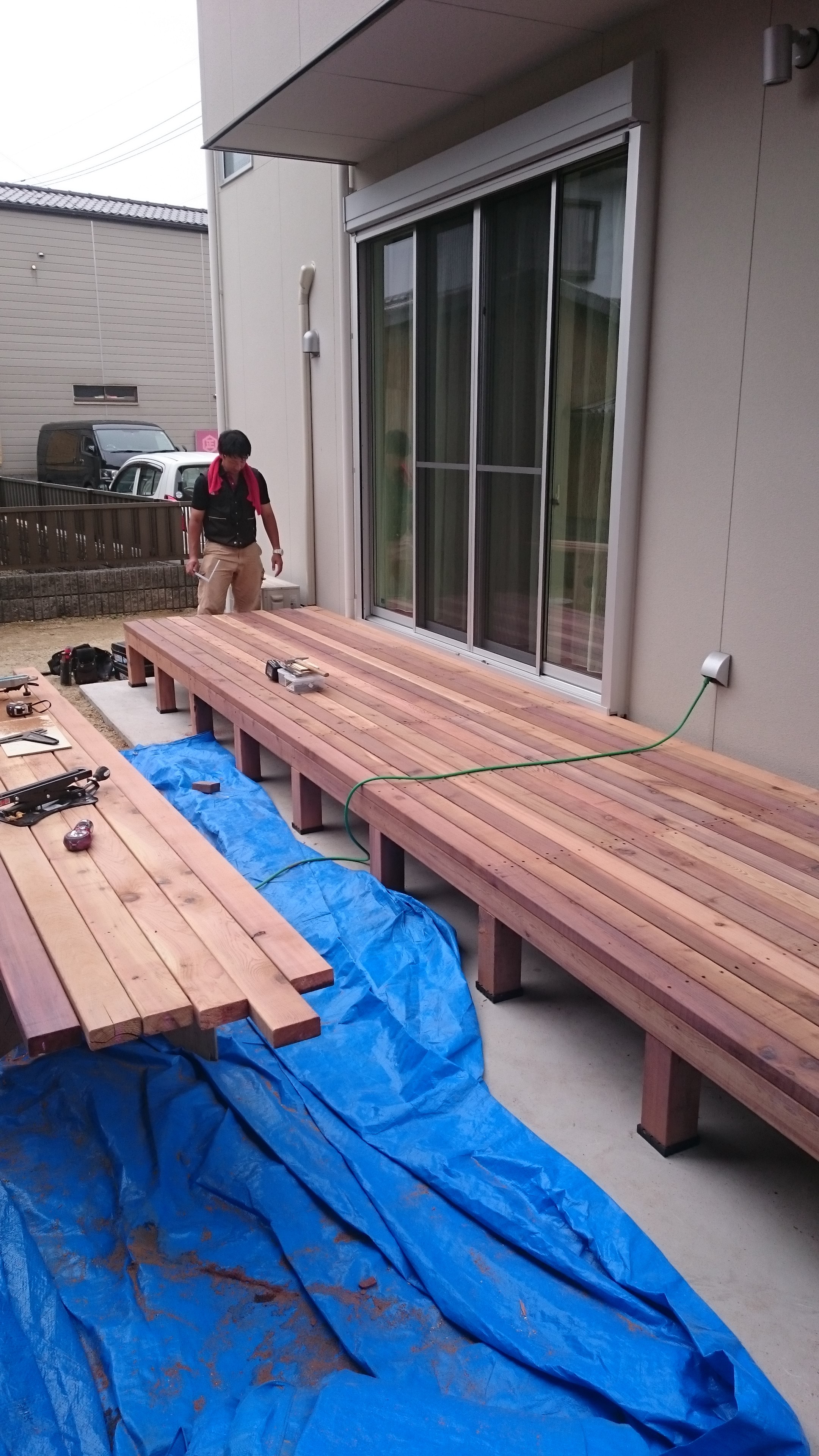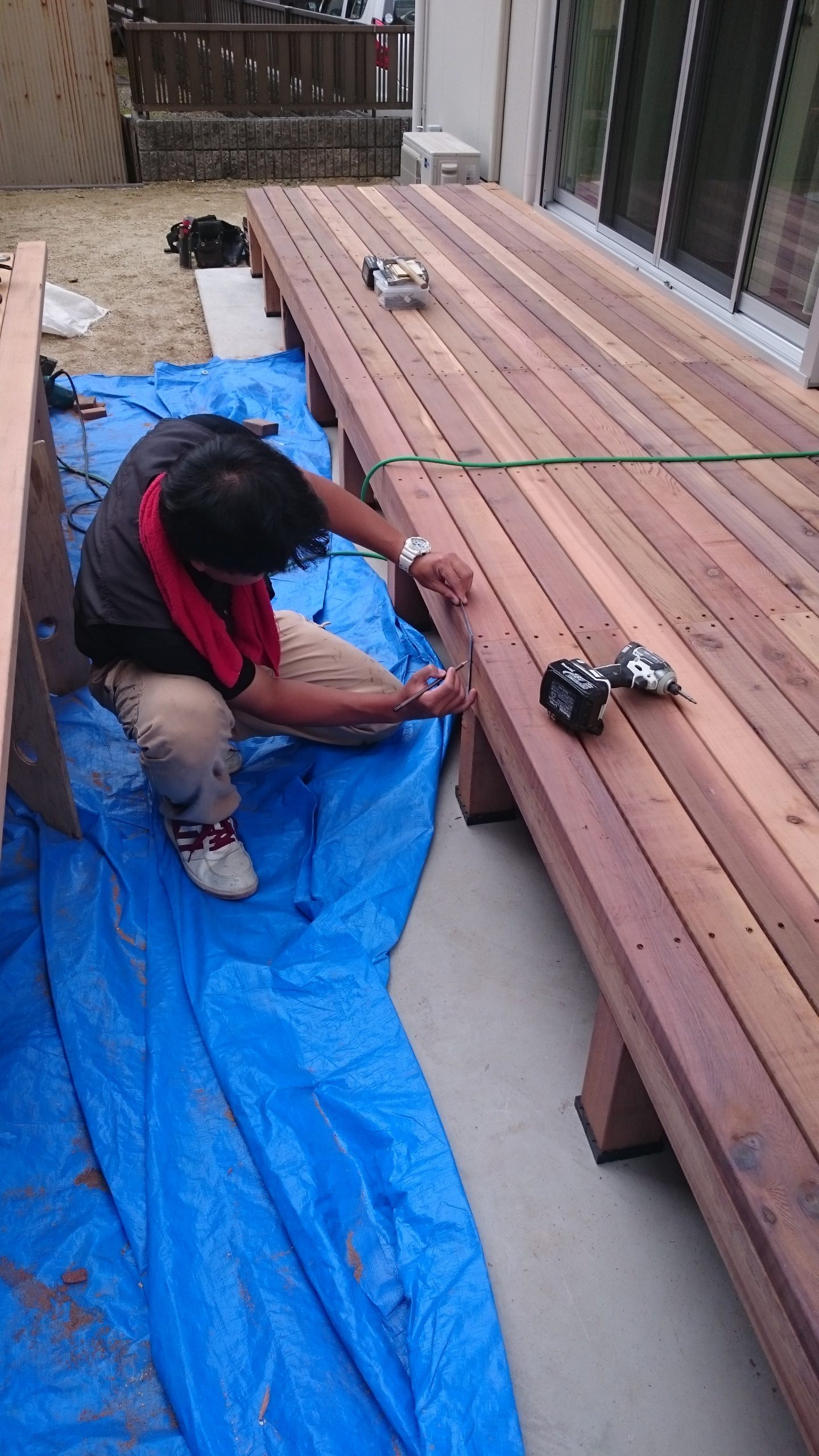 裏のウッドデッキも完成形が見えてきました。(^-^)