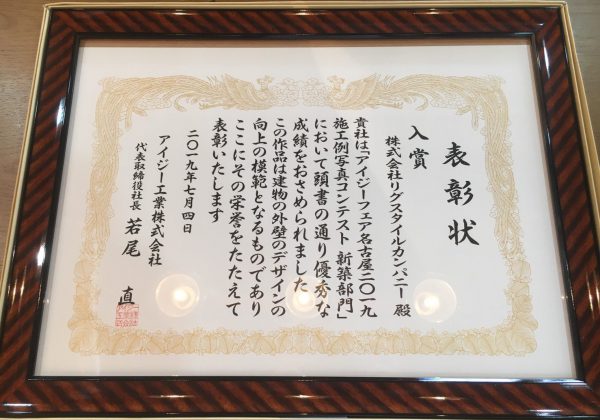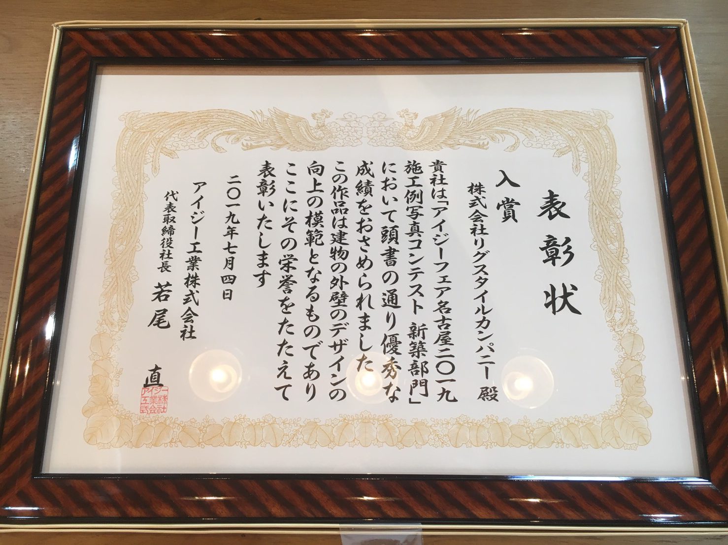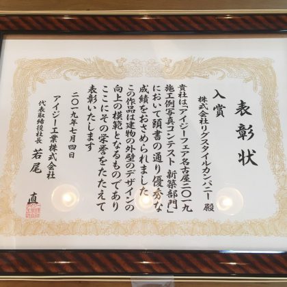 そのメーカーでもある、アイジー工業株式会社さんが6月に開催した「アイジーフェア名古屋2019」にて、施工事例コンテストが開催され、見事、当社リグスタイルカンパニーの施工例が「入賞」しました^^