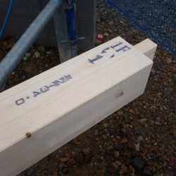 四方にお塩とお酒を撒き、「い通りの1番」の柱(いの一番)を建てさせていただき棟上げをスタート。