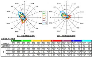 例えば4月や5月、10月や11月といった中間期は、昼夜共に北西側から吹いてくる風が多いというデータになっています。
