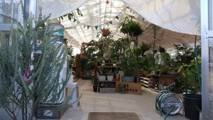 ビニールハウスの内外に所狭しと観葉植物が並びます。
