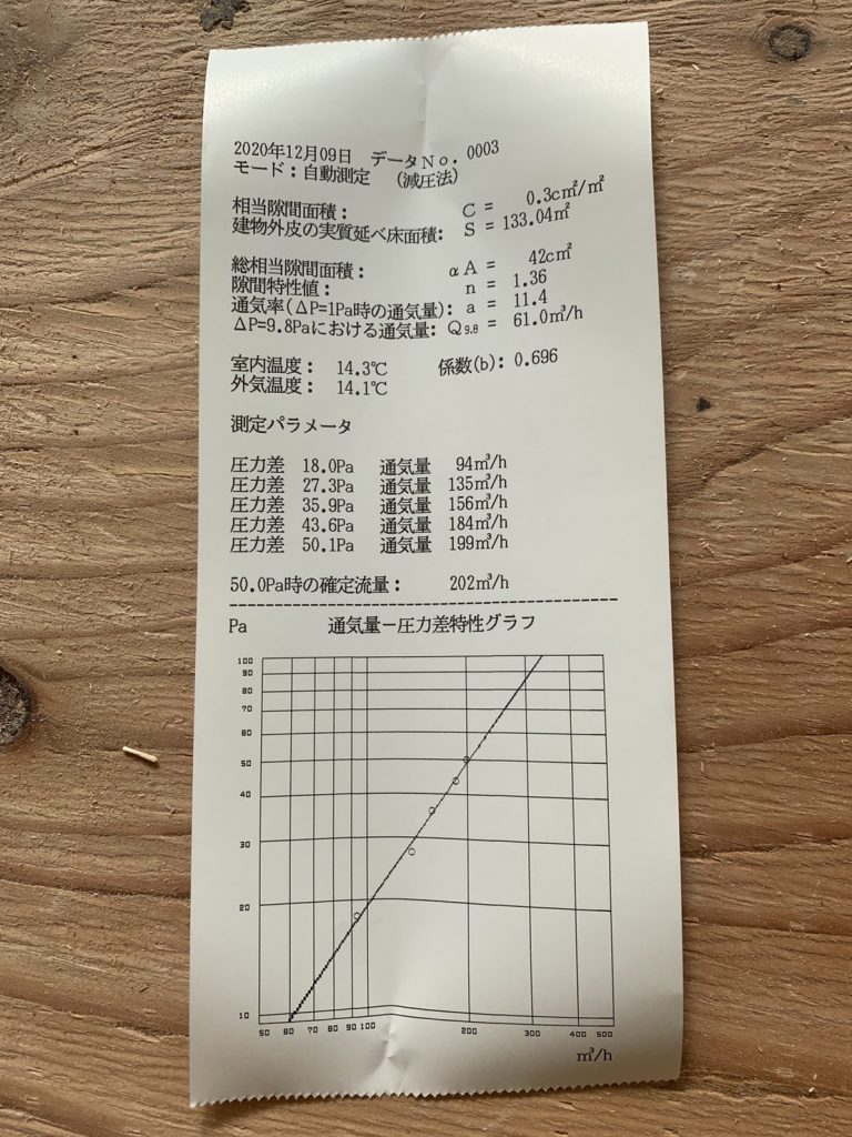 これまで、アベレージでC値:0.20㎠/㎡(高気密高断熱仕様の場合)という数字に比べると少々見劣りはしますが、気密処理を簡素化した上でのC値0.31㎠/㎡であれば、まぁまぁいい数値が出たんじゃないかなと思っています。(正直、C値0.5㎠/㎡は切れないと思っていました…)