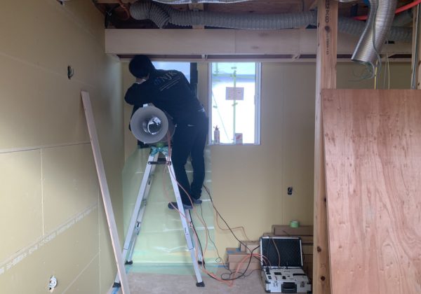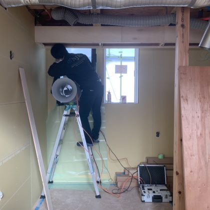 ですので、いつもは完成時に行う気密測定も、どこから空気が漏れているのかをチェックするために工事途中の現場で行いました。正直どこまでのC値がでるのかは、実測してみないと分からない…というドキドキ感満載の気密測定でしたが…