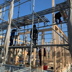 心地よい天気の中、何事もなく無事に棟上げが終了。いつもの通り、とてもチームワークのいい大工さんたち。賑やかに、楽しみながら、そして真剣に作業を進めていただき、16時には予定していた工程を終えることができました。