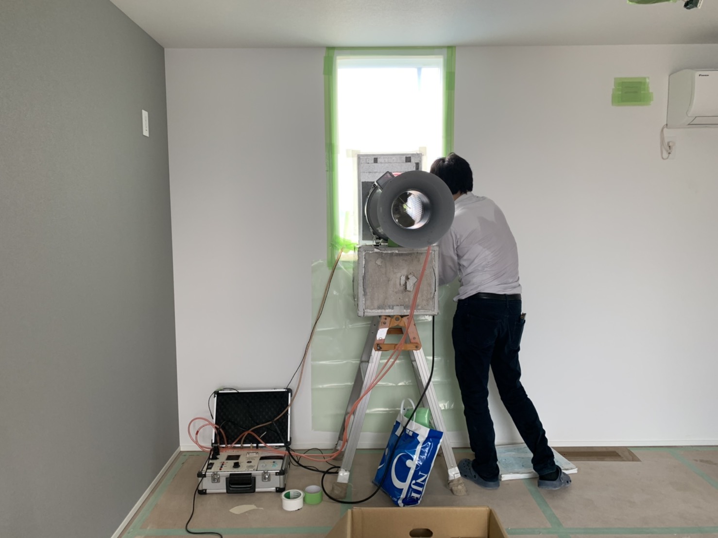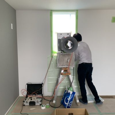 今月見学会を予定している現場では、気密測定を行いました。