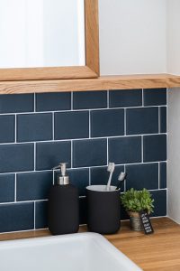 ネイビーやモスグリーン、ダークブラウンやグレーなど力ある色のタイルで