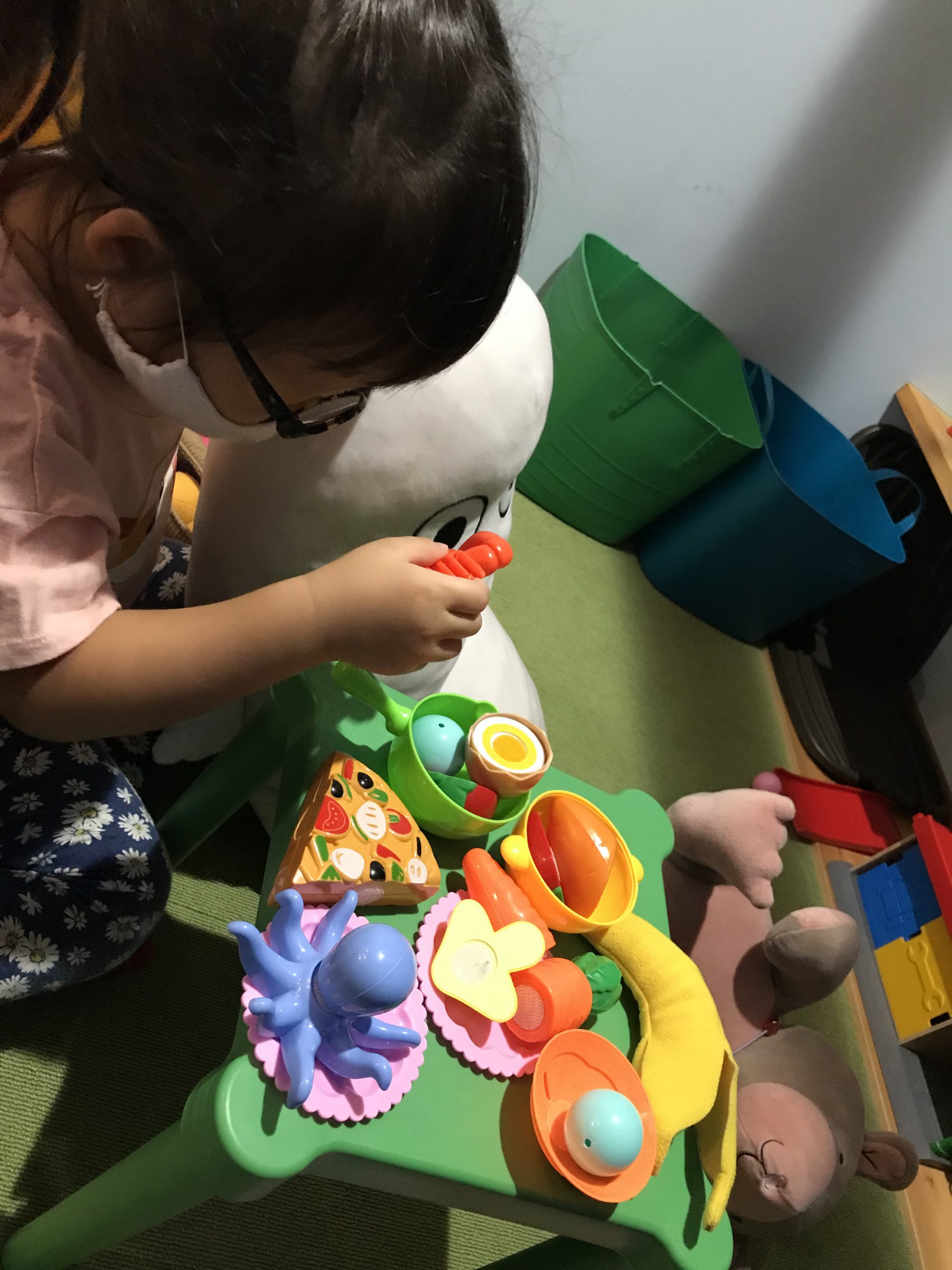 来店された1組目のお子さまたちは、人形を赤ちゃんに見立ててごはんや絵本を読んだり、「寝る時間だよ~」と布団まで用意するくらいの本格さ!よく分かっていますね!