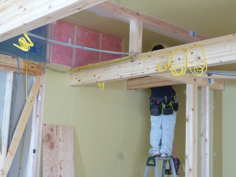 北方町のTさま邸は、内部では棟梁が壁の下地を黙々と施工中。