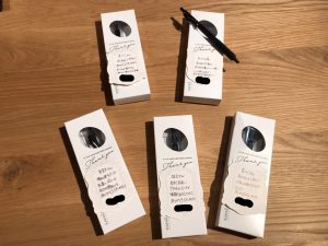 スタッフ全員にそれぞれのネーム入りボールペン、そして直筆メッセージカードを頂きました。