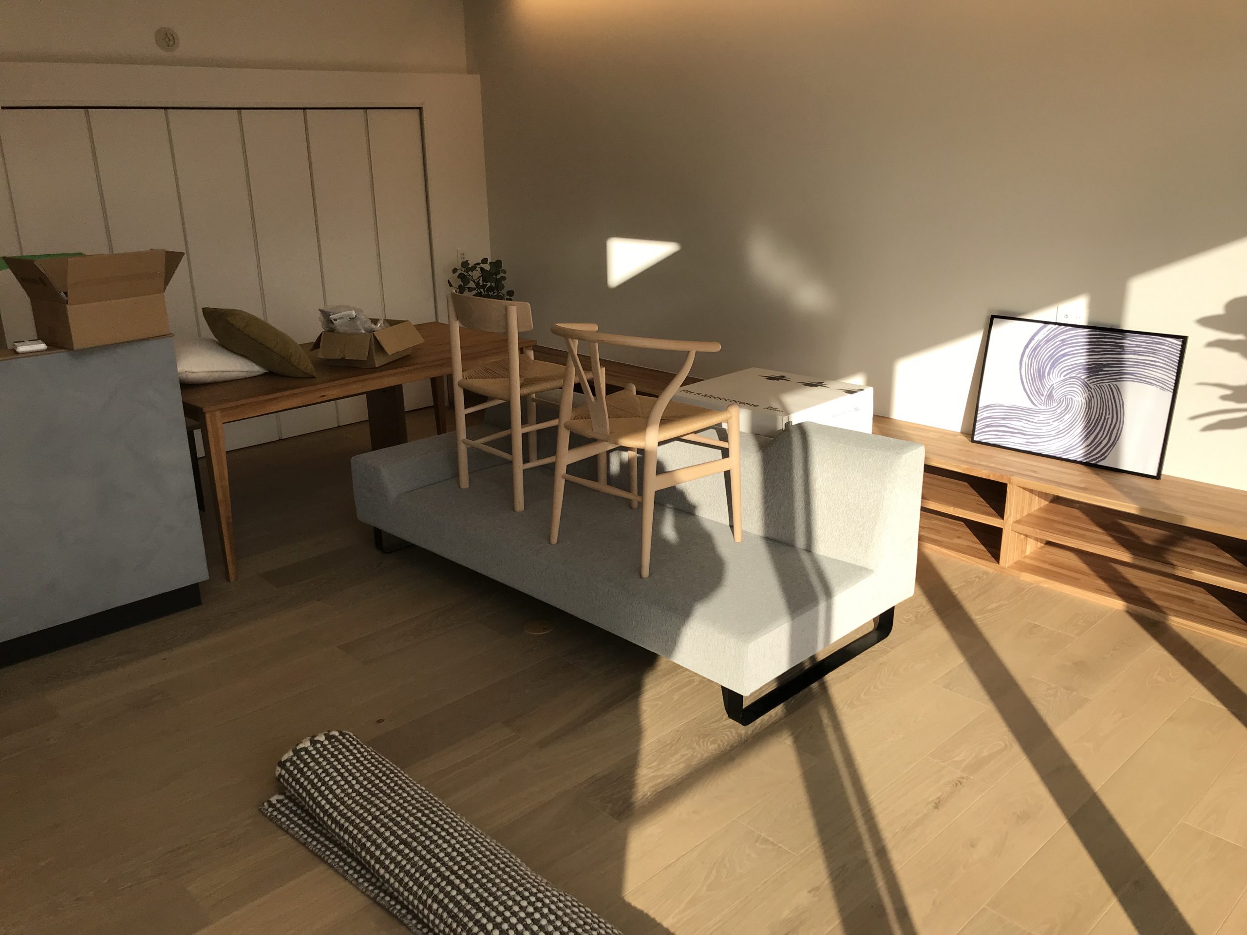 見学会がはじまる前の一週間の間に、スタッフがそのお家に合う家具や小物を運搬・設営しています。
