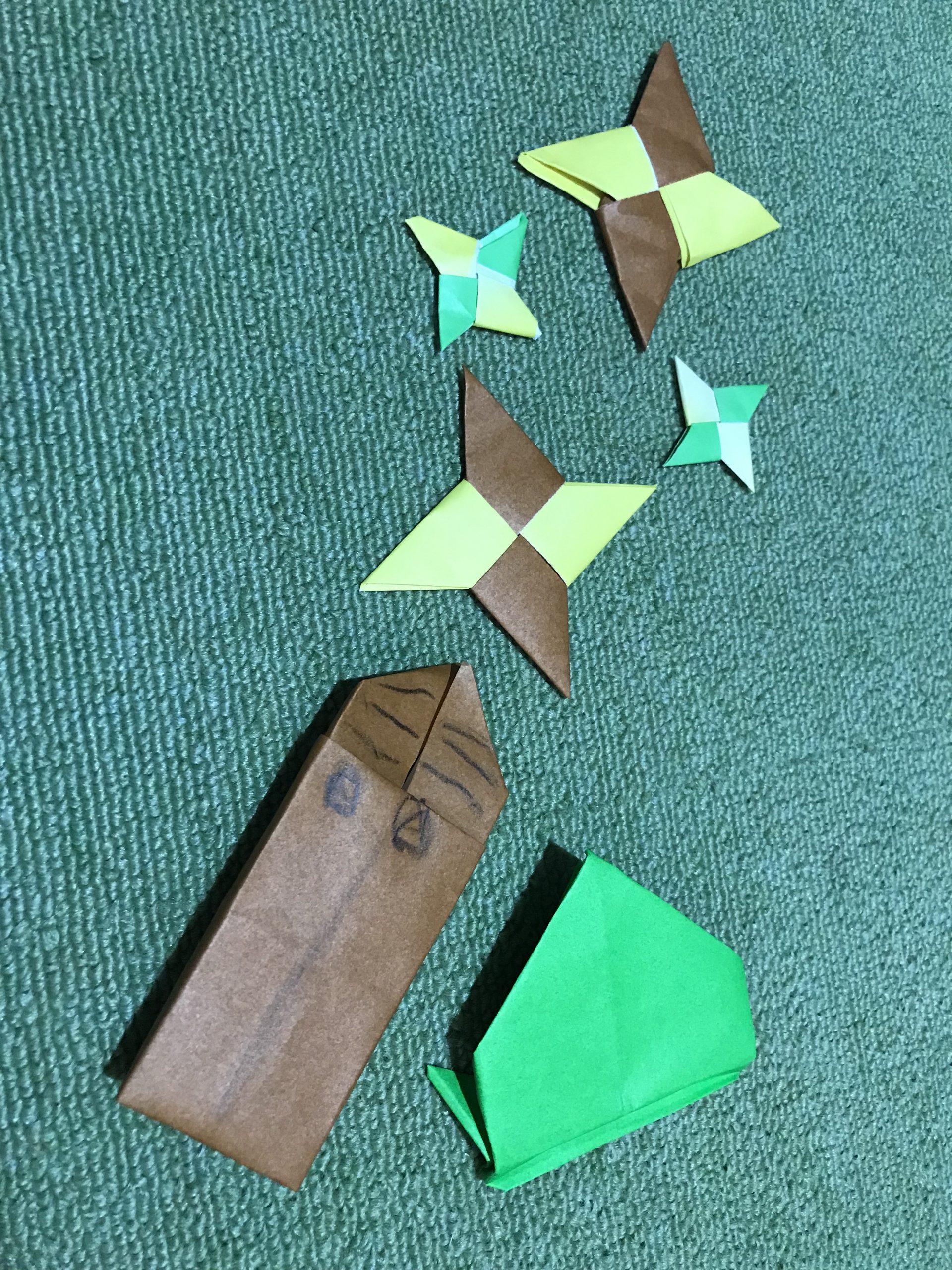 写真は1枚目は私と一緒にお子様が作った手裏剣とお子様が作ったクワガタとカエル。