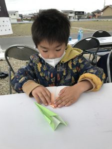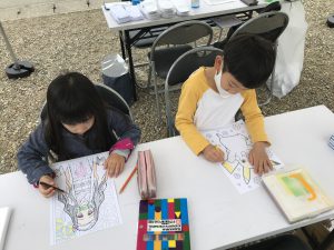 お子様連れの方には声を掛けてお外でお絵描きや折り紙制作のお遊びタイム♪