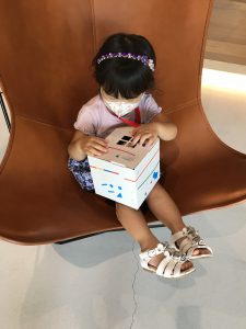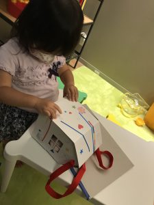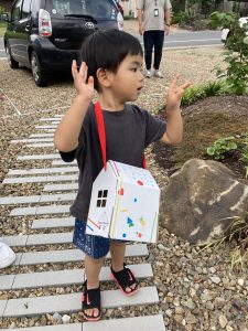 完成したお家をお父さん、お母さん、スタッフに見せて少し照れ気味💗な子や
