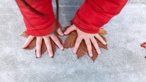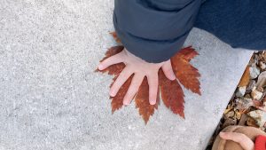 大きな落ち葉を見つけて、手を乗せると手の方が小さい‼︎🍂