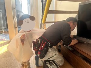 アンテナBOXを調整する為、電気屋の大橋さんがはしごを登ってくださっているのですが