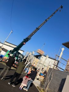 クレーン車で木材を上まで持ち上げて、大工さんが上で骨組みを組み立てていきます。