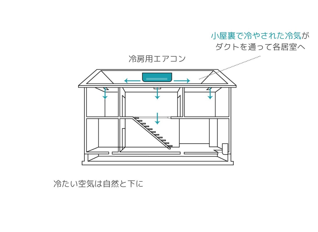 小屋裏エアコンは熱のこもりやすい小屋裏にエアコンを1台設置。小屋裏からファンを使い、各居室につながるダクトを通して、冷気を送っています。