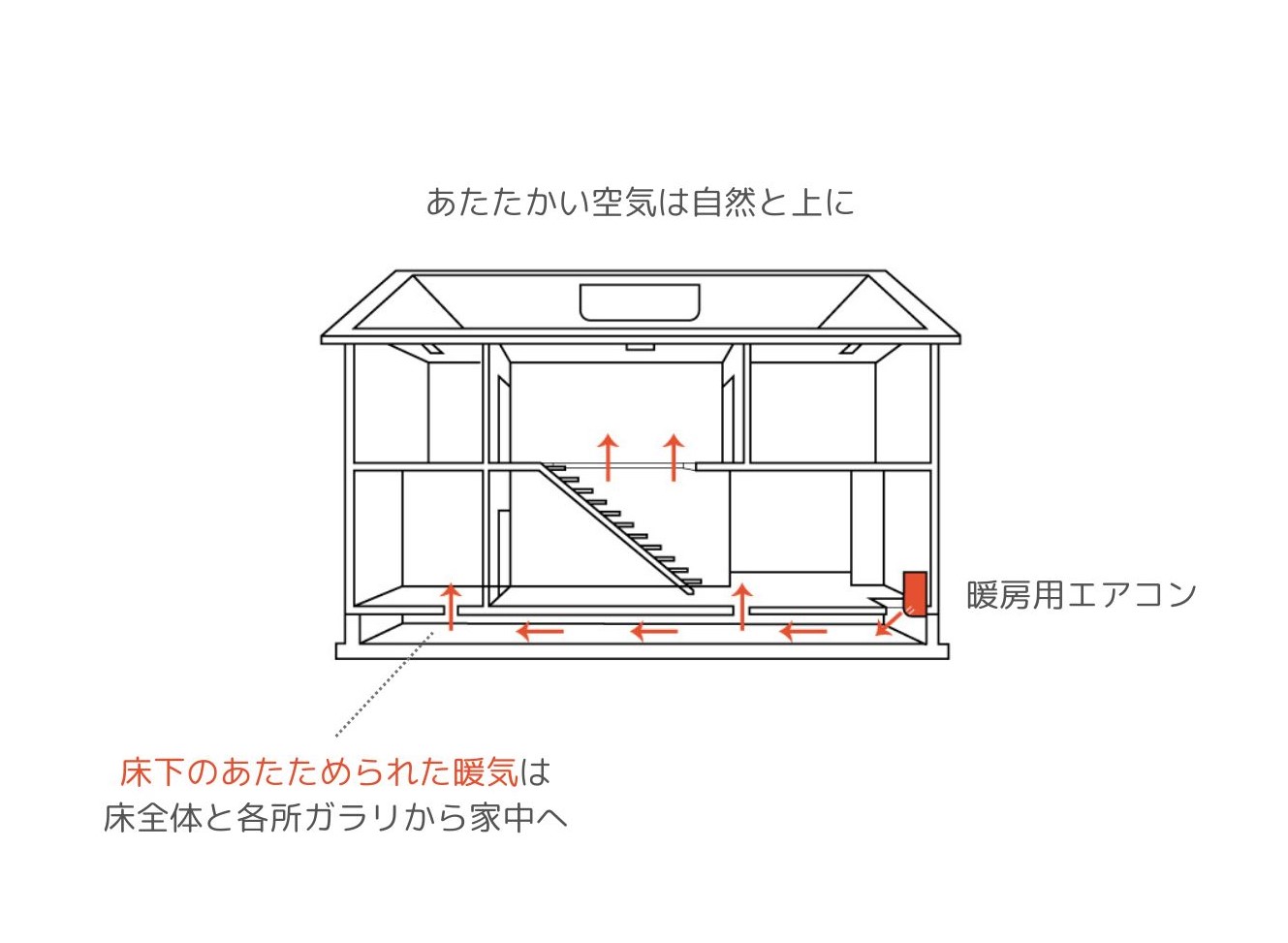 床下エアコンはエアコンの風を床下へと送り、床全体をあたためながら各所に設置されたガラリを通って家全体をあたためます。