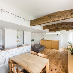 無垢のフローリングやアンティーク調の梁で魅せる優しいイメージのナチュラルスタイルに、ブラックやアイアンをミックスさせることで、あえて可愛さを抑えながらコーディネイトした、大人のナチュラルスタイルを実現しました。