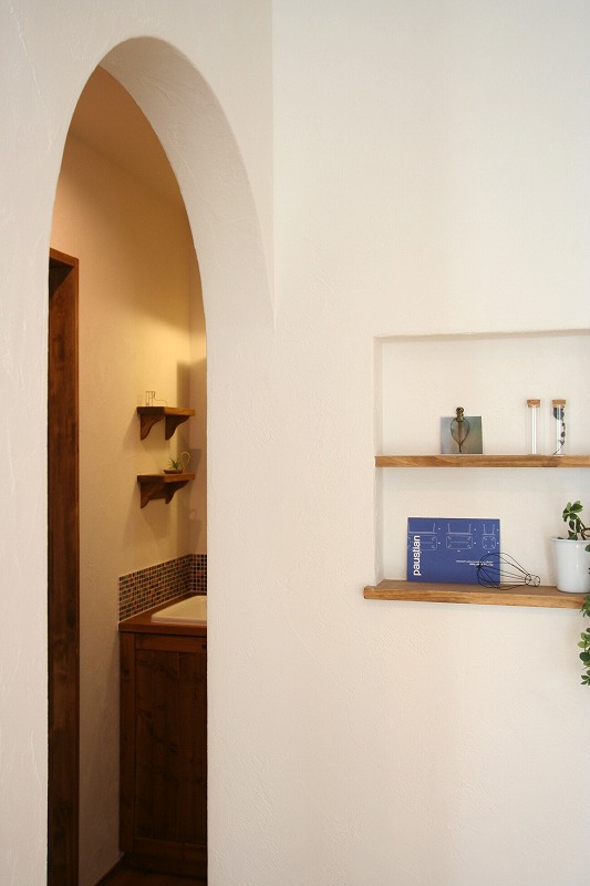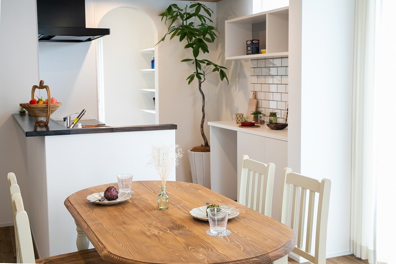 グレーの三角屋根の外観はスタイリッシュな印象ですが、中に入ると、オークの無垢フローリングが落ち着いた空間を創りながら、アールの垂れ壁やアンティーク調の梁が、女性好みのキュートな遊び心を演出します。