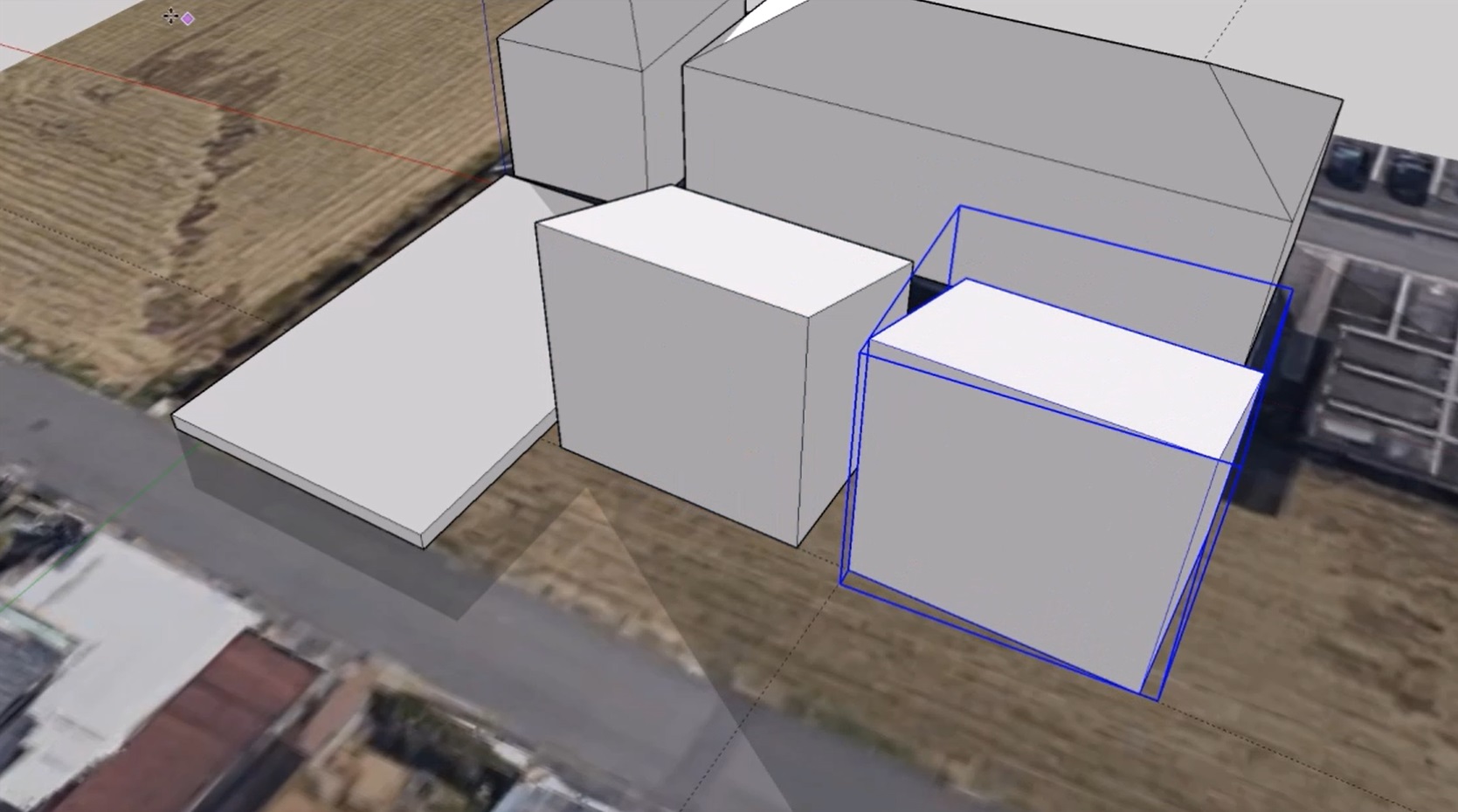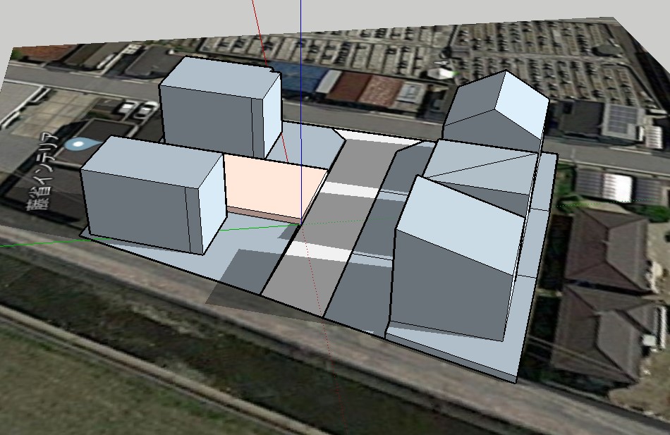専用ソフトで、測定した周辺建物を復元。さらに、将来建築が予想される場所にも建築物を建てます。