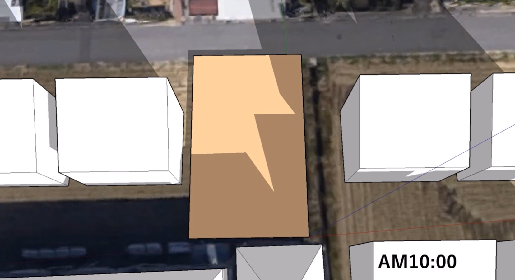 購入を検討している土地に対して、現存の周辺建物や、将来的に建築物が建った時を想定しながら、日中の日当たりがどのように推移するのかを、シミュレーションソフトを用いて解説いたします。