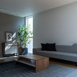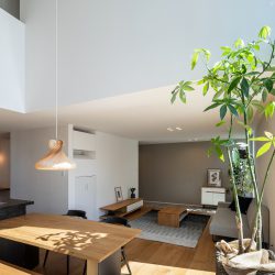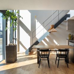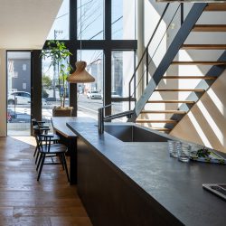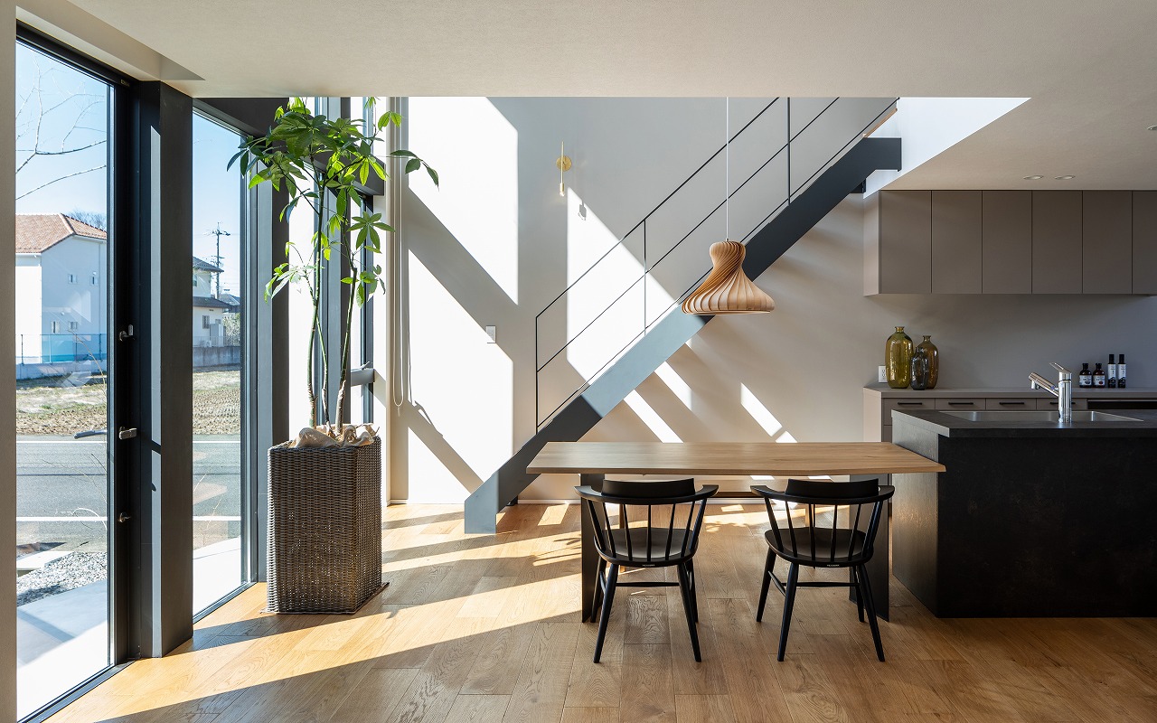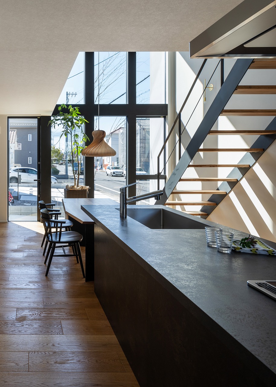 tripを象徴する大きな連窓はそのままに、黒いガルバリウムでスタイリッシュに仕上げた外観デザインと、白とグレーを基調に、オークのフローリング、GRAFTEKTのキッチンや鉄骨階段などの家具も映えるコーディネイトで仕上げた内装は必見です。