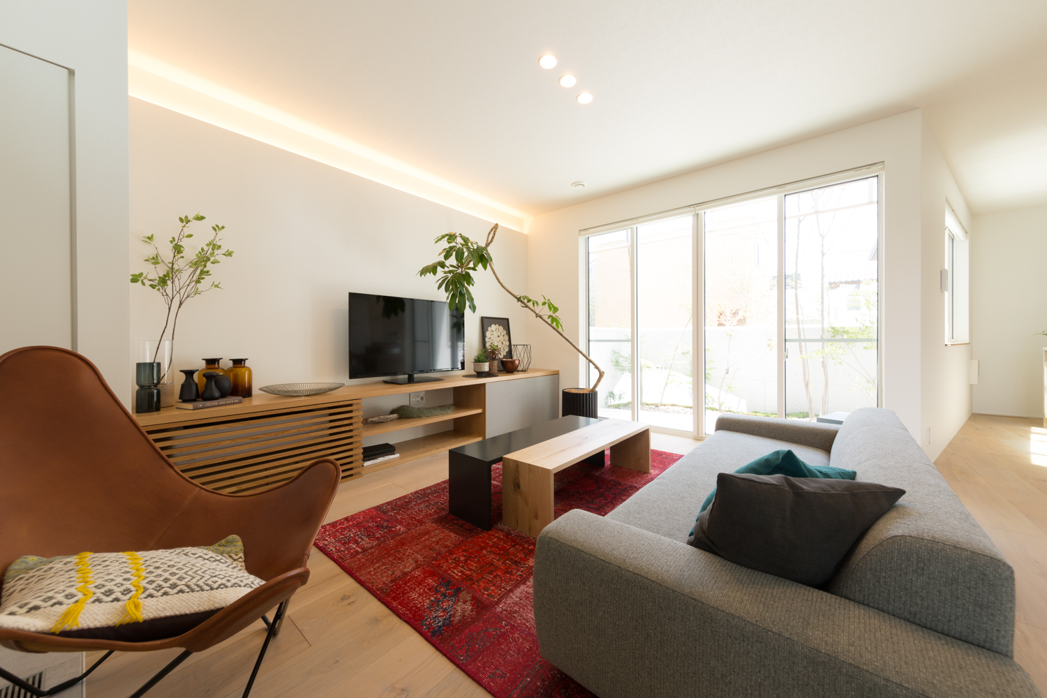 南道路の敷地に建つ家は、大きな窓から太陽の光が差し込み、真冬でも暖房が要らないほど暖かい空間を実現。