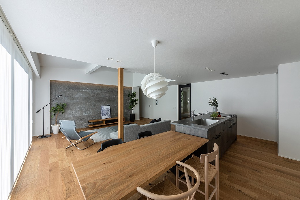 外観は、塗り壁やSOLIDO、木製ルーバーをバランスよく配置し、落ち着きのあるモダンなデザインに。室内は、天井高と、窓から降り注ぐ太陽の光がLDKを優しく包み込み、真冬でも暖房が不要なほど快適な空間を実現。