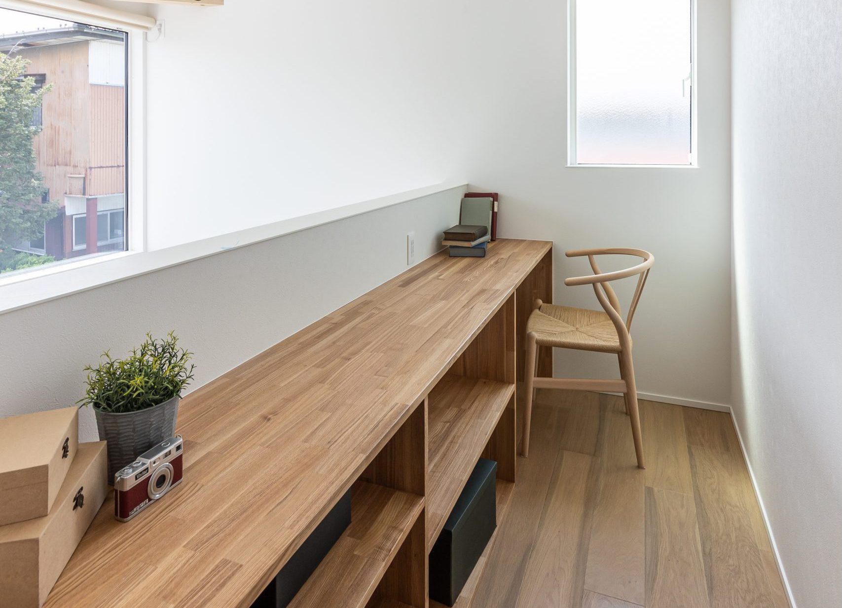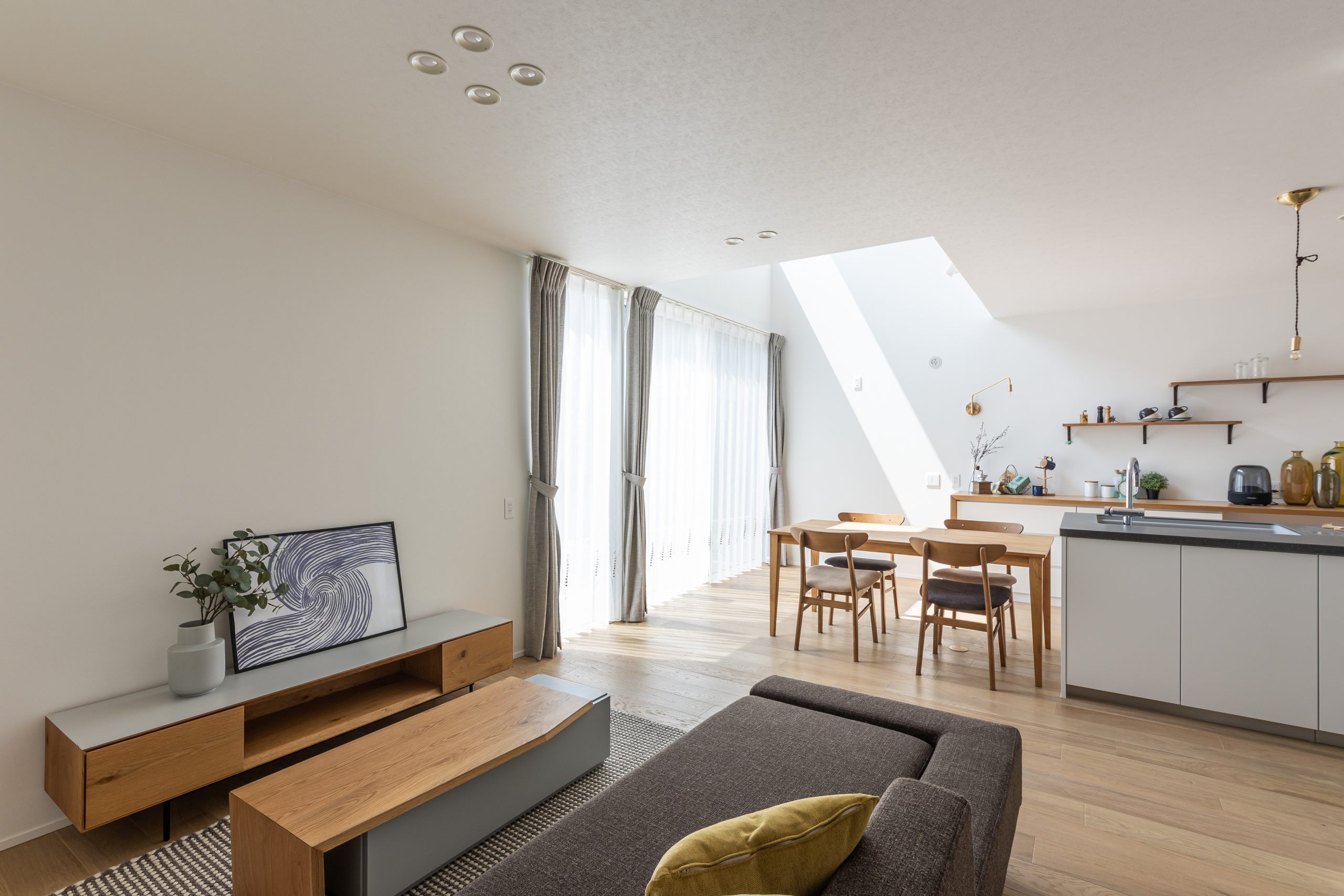 南側に建物があり、日当たりを確保するために何度もシミュレーションを行いながらつくり上げた設計により、窓から降り注ぐ太陽の光がLDKを優しく包み込み、木の温かみを感じられる優しい雰囲気に仕上がりました。