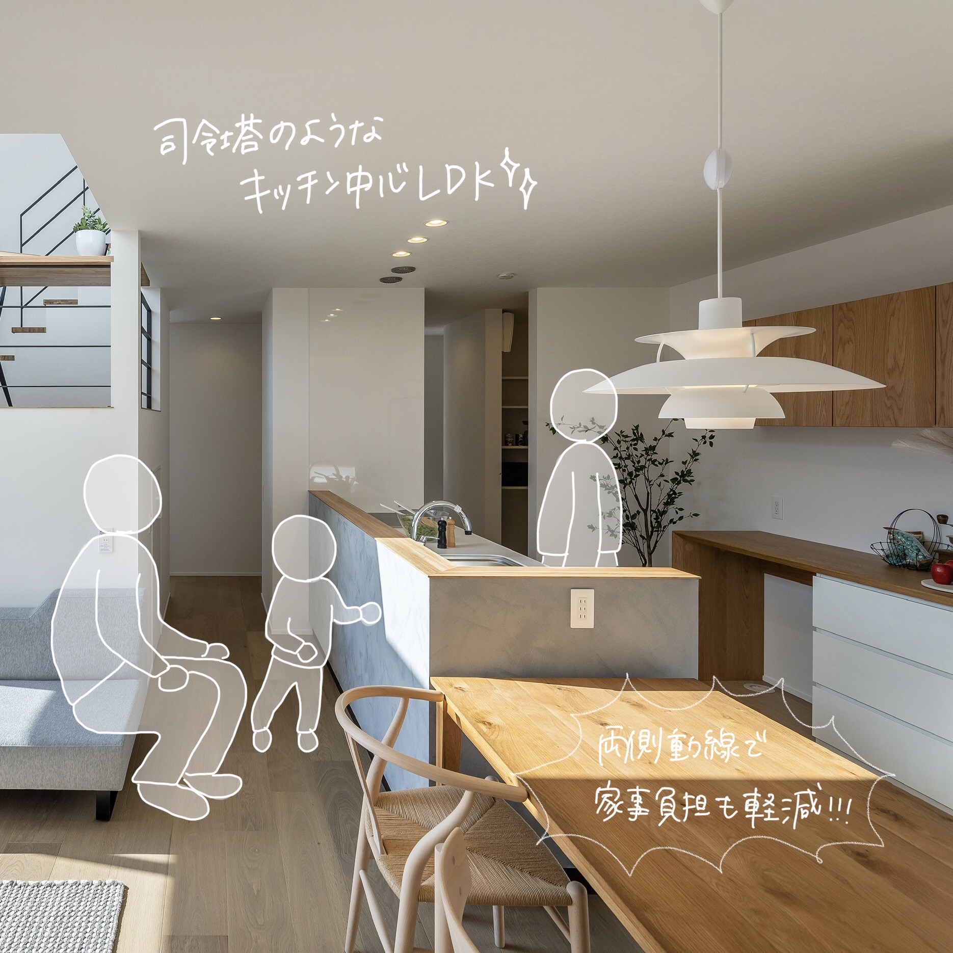 周りをぐるりと回れる独立型のキッチンは、抜群の開放感があり、家事動線を短くします。LDK全体を見渡せるキッチン配置で、料理中も家族と顔を合わせながら会話を楽しむことが可能に。