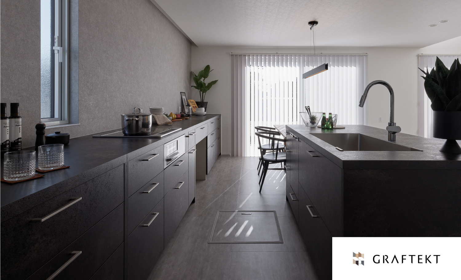 すっきりとしたデザインかつコストパフォーマンスで人気のグラフテクトのキッチンを採用。色はメルクリオをチョイスしています。
