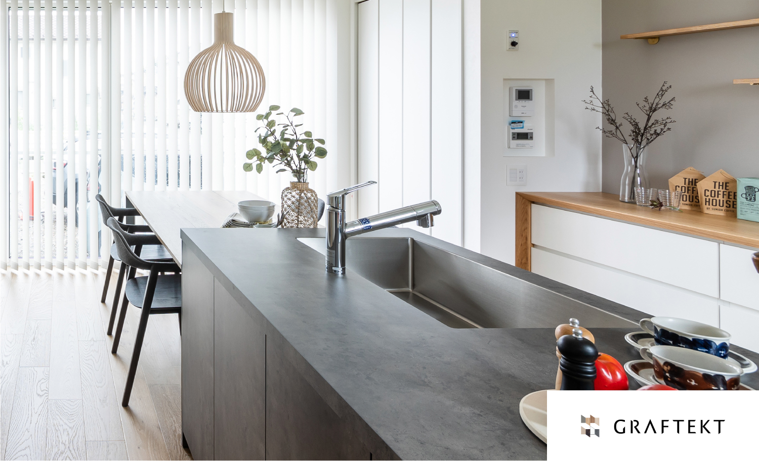 スタイリッシュかつコストパフォーマンスで人気のグラフテクトのキッチンを採用。色はべトングレーをチョイスしています。