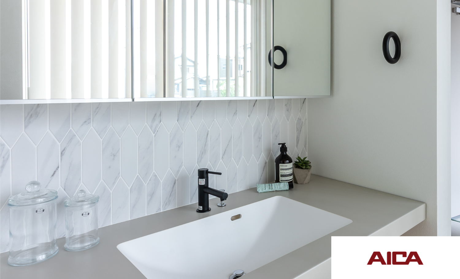 アイカ工業のスマートサニタリーを採用。「洗面カウンター」×「棚板」のシンプルなデザインで、スタイリッシュな空間を邪魔しません。