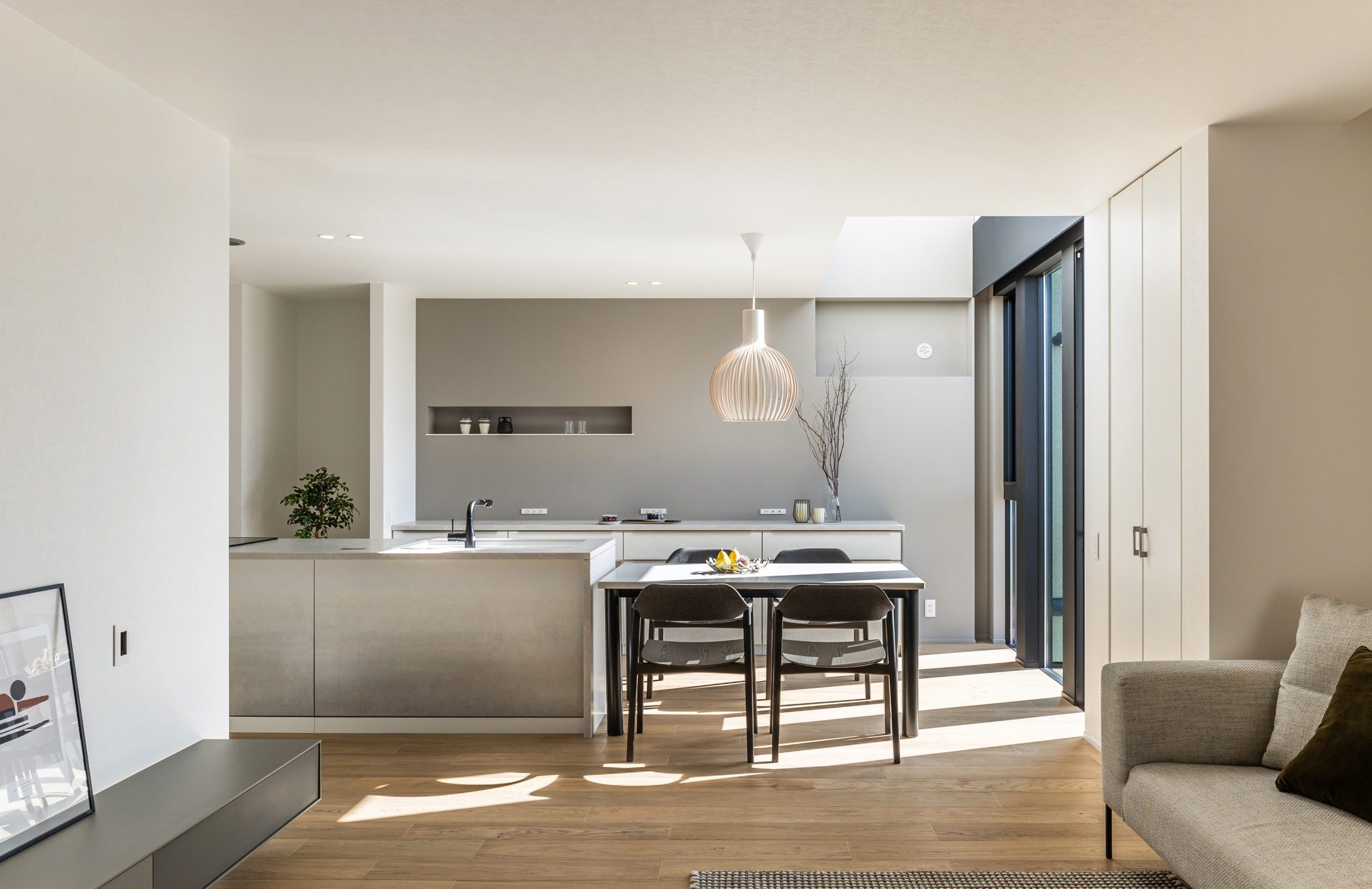 中に入れば、アイランドキッチンを中心に計画したL字型の間取りにより、家族や友人が集まりやすく、人の輪が自然と生まれるLDKが広がります。