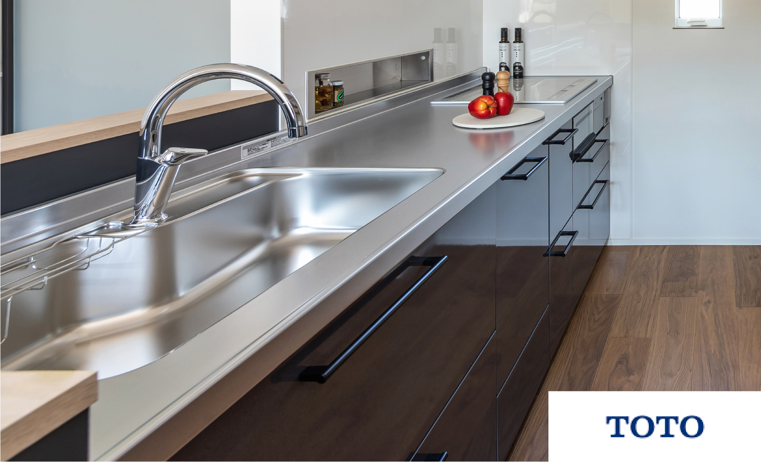 普段は共働きで忙しいご夫婦が、ストレスを感じることなく、ゆっくりと暮らせる家を目指し、キッチンのフロアタイルや、カウンターとボウルが 一体型の洗面など、清掃性や機能性を重視したアイテムを随所に取り入れました。