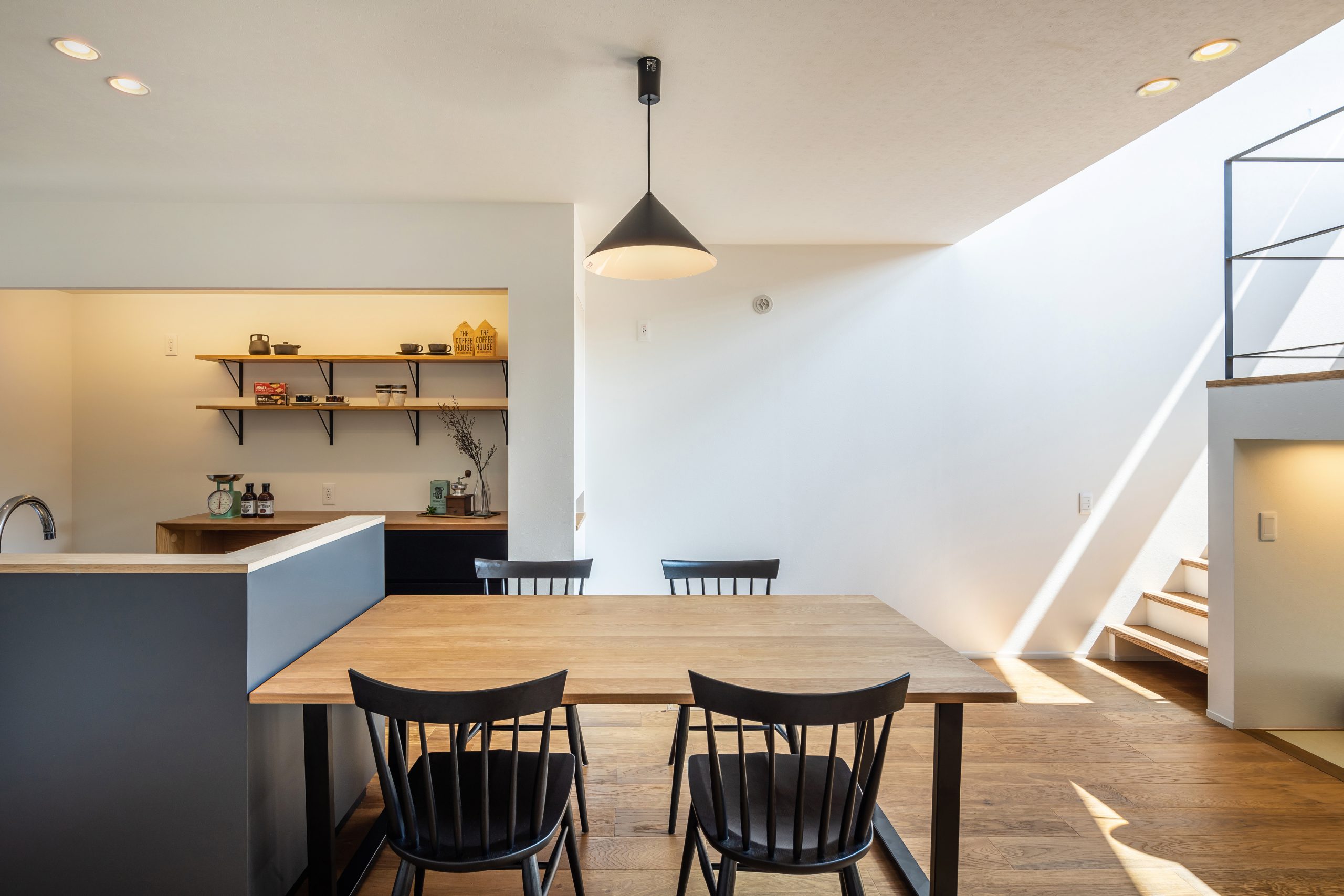 晩酌がお好きというお施主様が「自宅バー」をお楽しみいただけるように、カウンターも兼ねたキッチンを計画し、家族の時間も、ひとりの時間も大切にできる理想の空間。