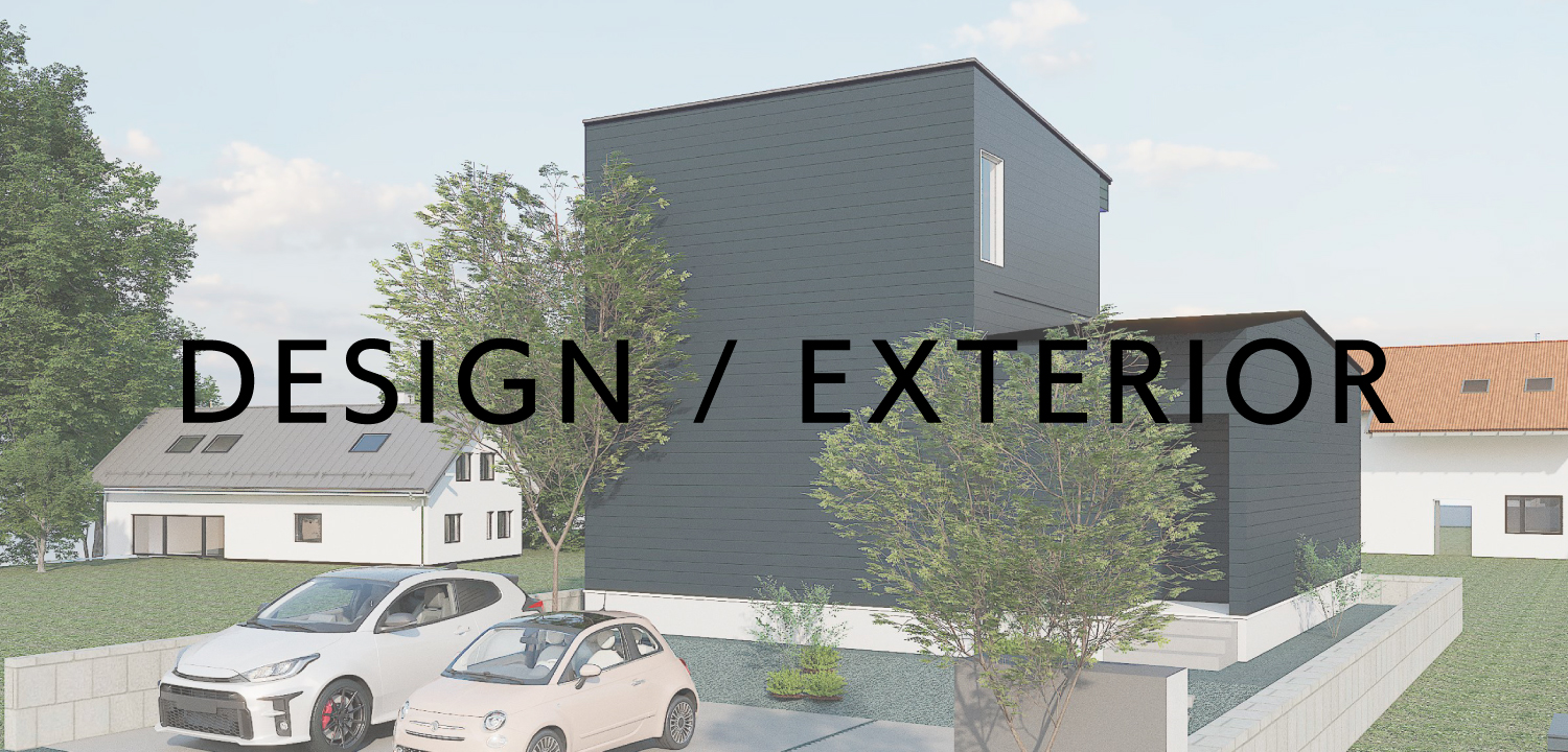 ブラックのガルバリウム鋼板でシンプルに仕上げたBOX型の外観。