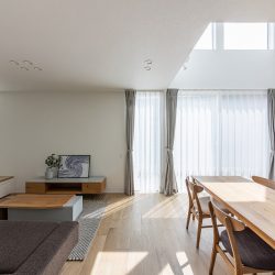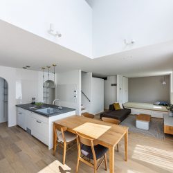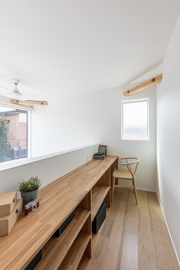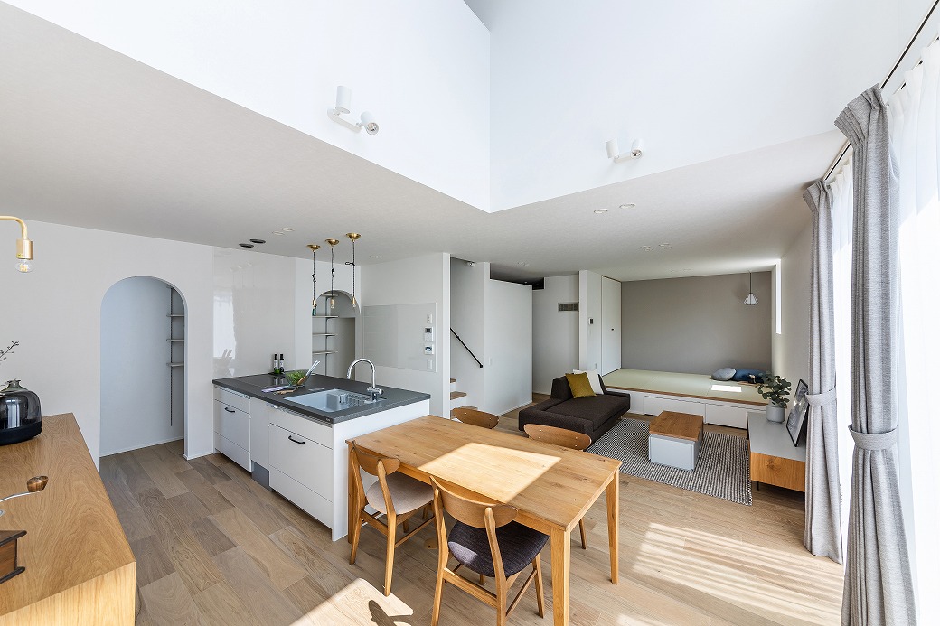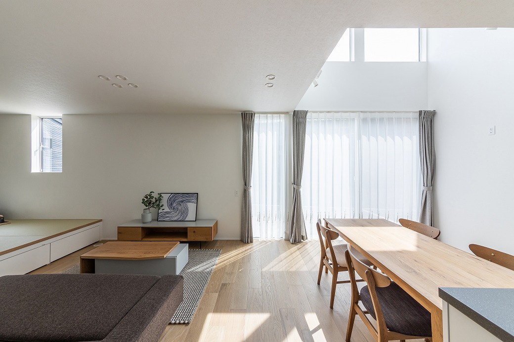 異素材のバランスと、お家の中の想像がつきにくい外観デザインで、存在感を引き立てます。南側に建物があり、日当たりを確保するために何度もシミュレーションを行いながらつくり上げた設計により、窓から降り注ぐ太陽の光がLDKを優しく包み込み、木の温かみを感じられる優しい雰囲気に仕上がりました。