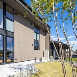 シンプルtripを象徴する大きな連窓はそのままに、北面ファサードはグレーの塗り壁でシックに仕上げた外観デザイン。