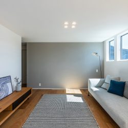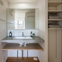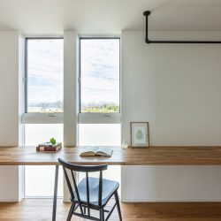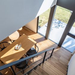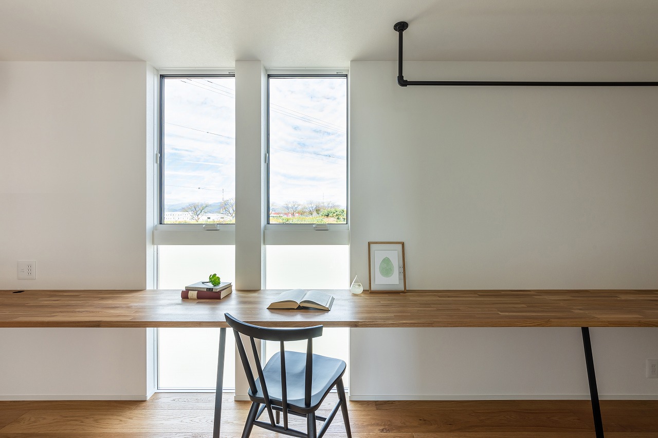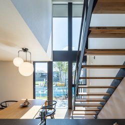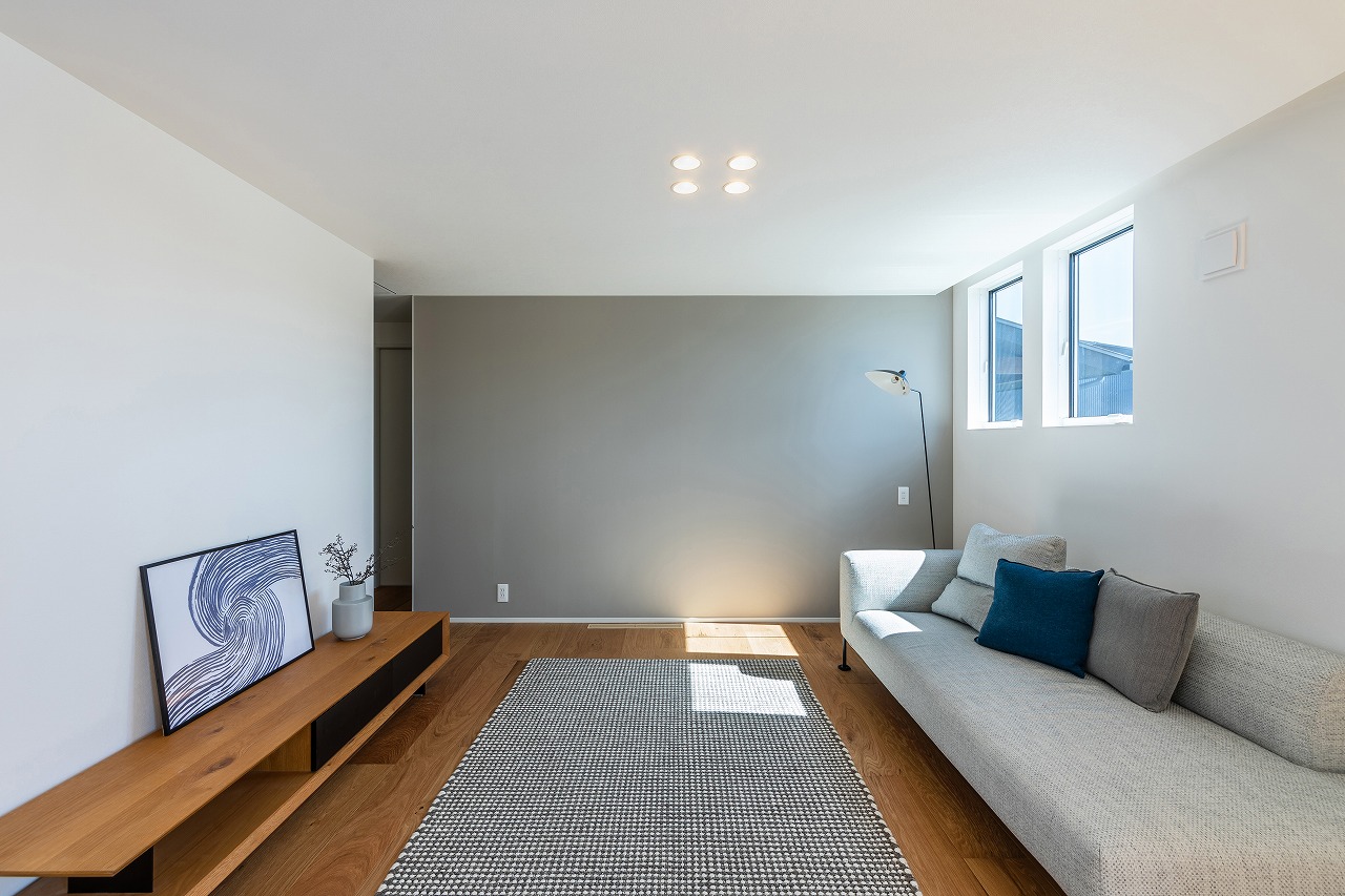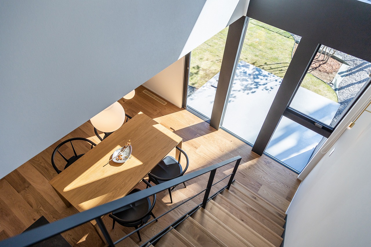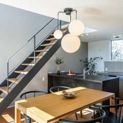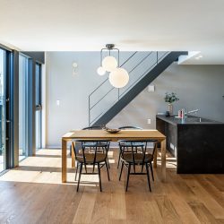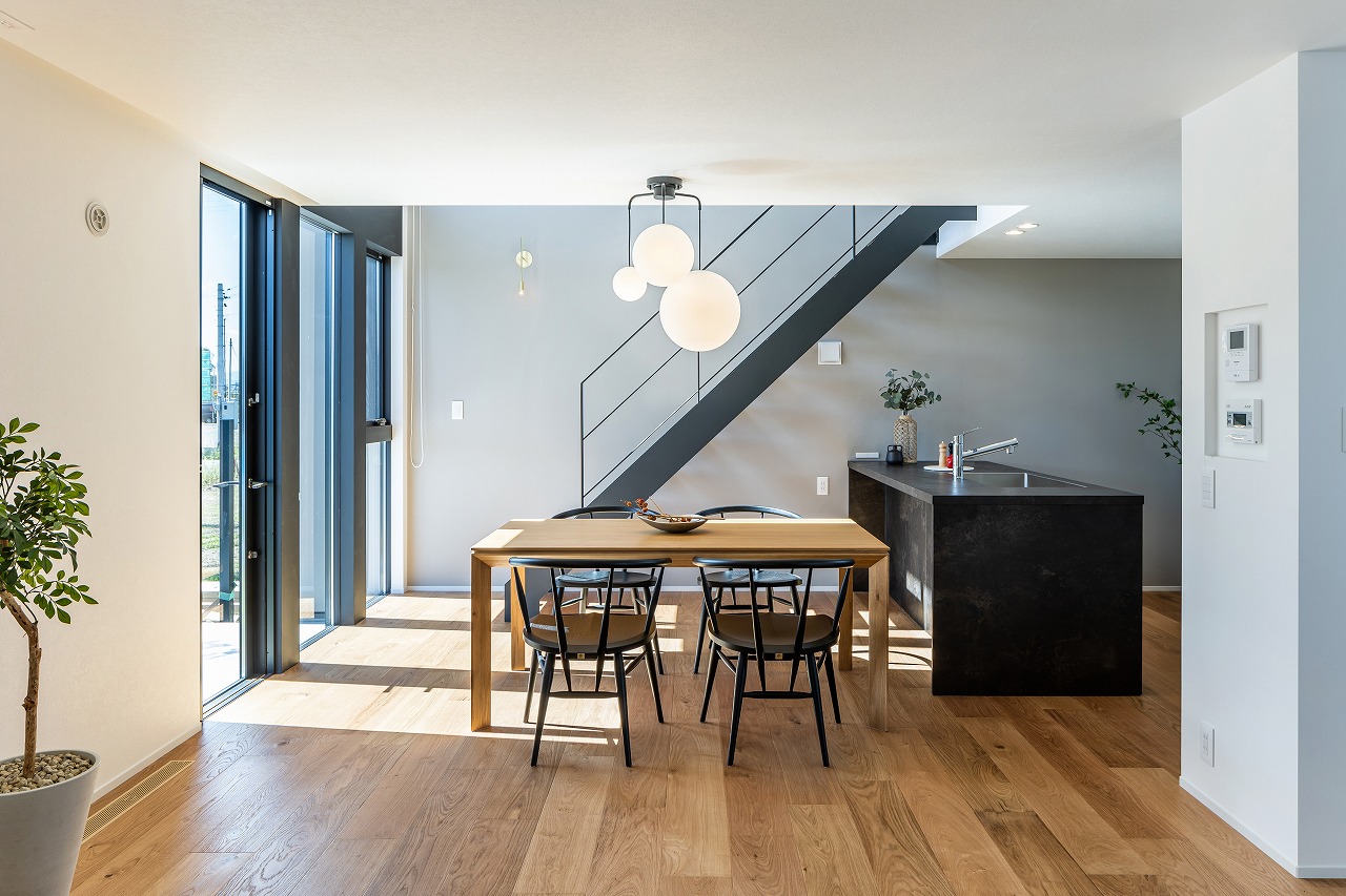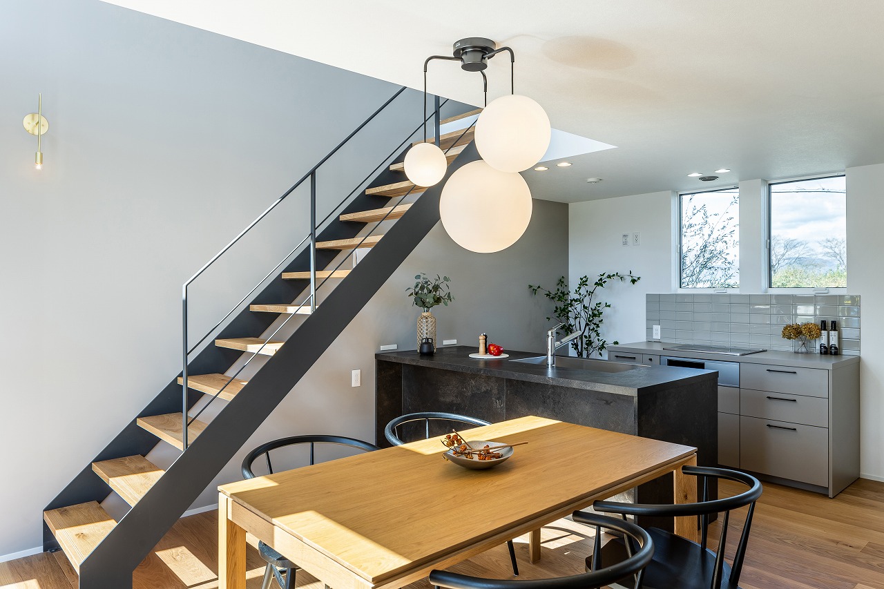 内装は、白とグレーを基調に、オークのフローリング、GRAFTEKTのキッチンや鉄骨階段など、家具も映えるコーディネイトで仕上げました。