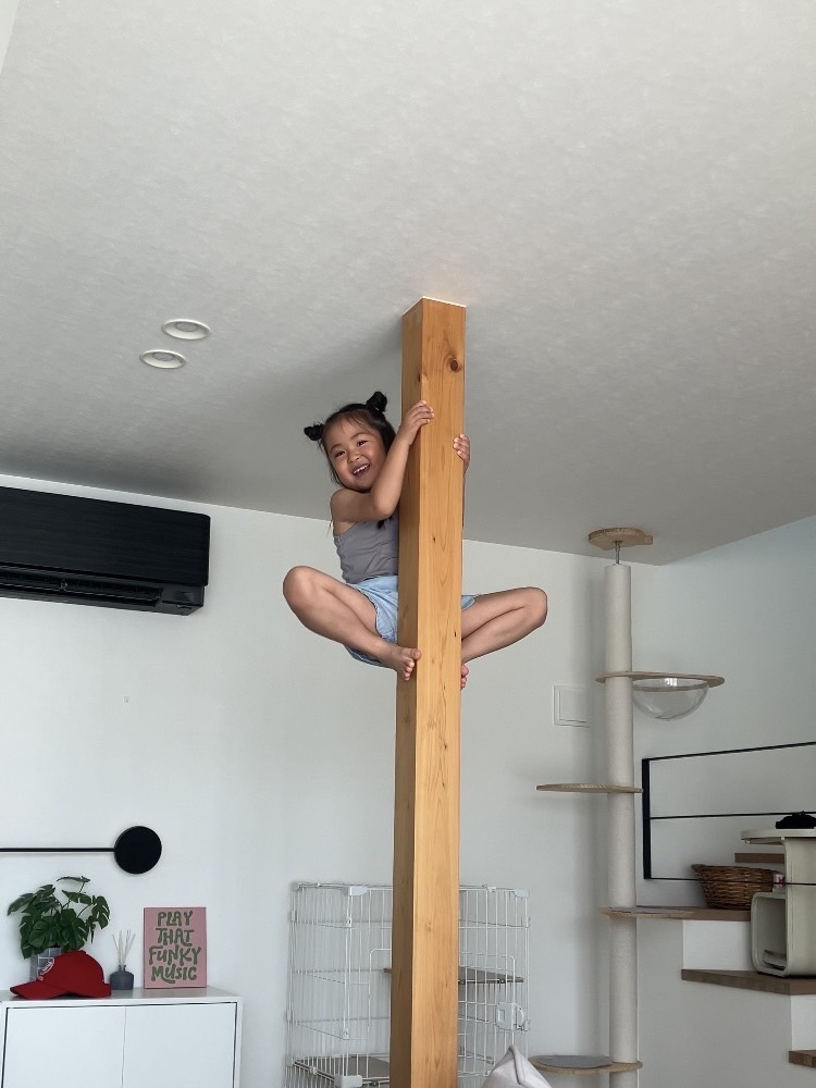 天井まで届く立派な柱を、力いっぱい登る姿がとってもキュート!