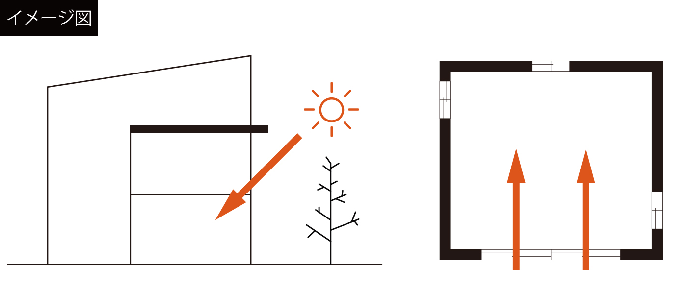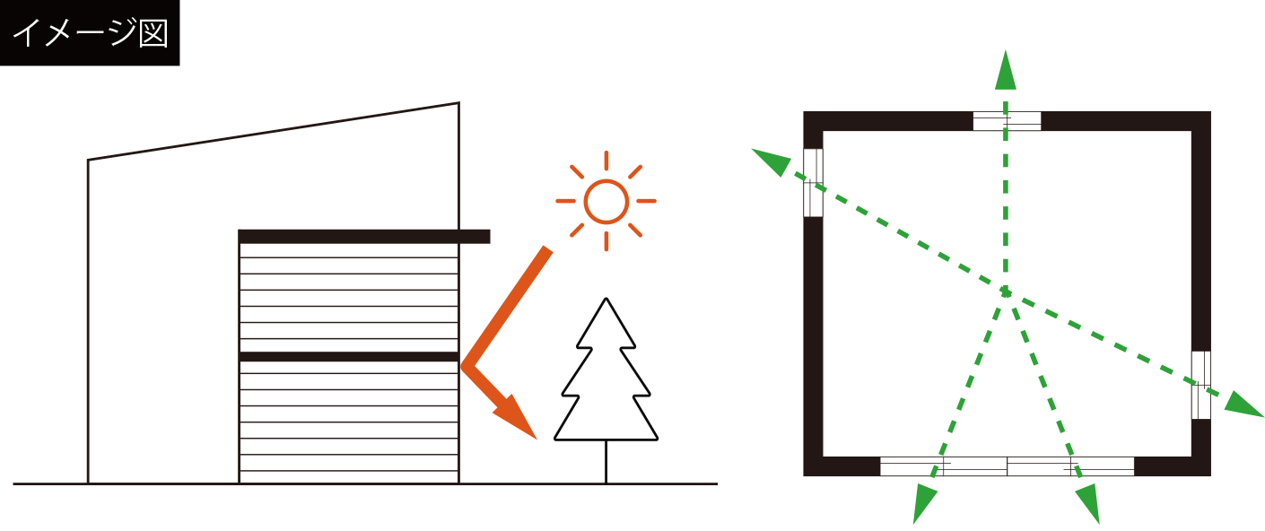 夏のためのパッシブデザインに欠かせない要素は「日射遮蔽」です。太陽熱が室内に入らないように、庇やルーバーを用いて、窓の日よけをデザインしながら、涼しさを決めるベースを創ります。