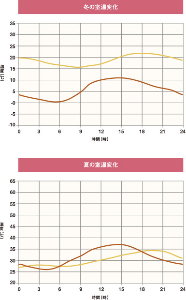 冬の朝は薄手のカーディガンを羽織る程度で十分な暖かさ、晴れた日の昼間は暖房いらずの快適さを実現。夏でも、外気温の下がる夜なら、窓を開けるだけで快適な室温に。エアコンなしでぐっすり眠ることを可能にします。