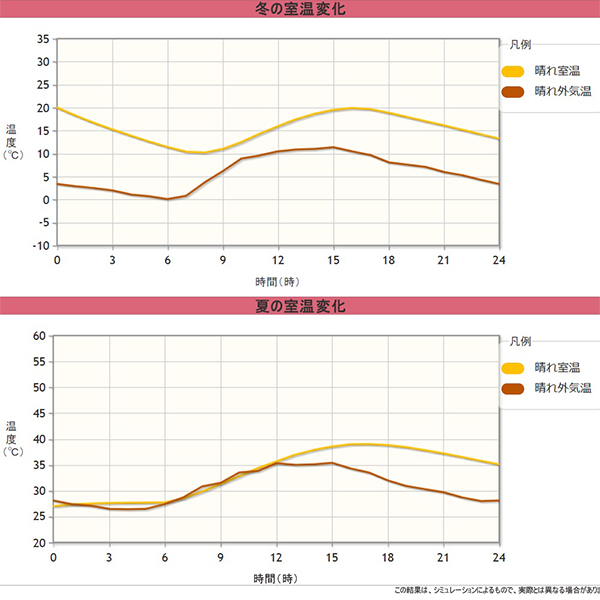 また、性能数値の計算を踏まえ、建築予定の家の中で、どのような室温推移が期待できるのかを、専用ソフトを利用した室温シミュレーションを作成し、住み始めた後の快適性も見える化することで、根拠を持ち合わせた快適な住空間の実現に努めています。